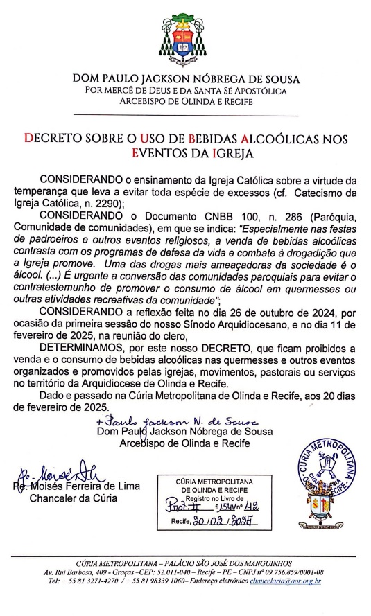 O arcebispo de Olinda e Recife, Dom Paulo Jackson, constituiu e instalou o novo Conselho Presbiteral da Arquidiocese, conforme estabelece o cânon 501 § 2 do Código de Direito Canônico e o Estatuto do Conselho Presbiteral da Arquidiocese. Alguns membros do Conselho foram eleitos, alguns nomeados e outros incluídos no Conselho por direito de ofício, ou seja, por exercerem outro cargo na Arquidiocese. O Conselho foi divulgado em decreto assinado pelo arcebispo em 25 de março de 2024.