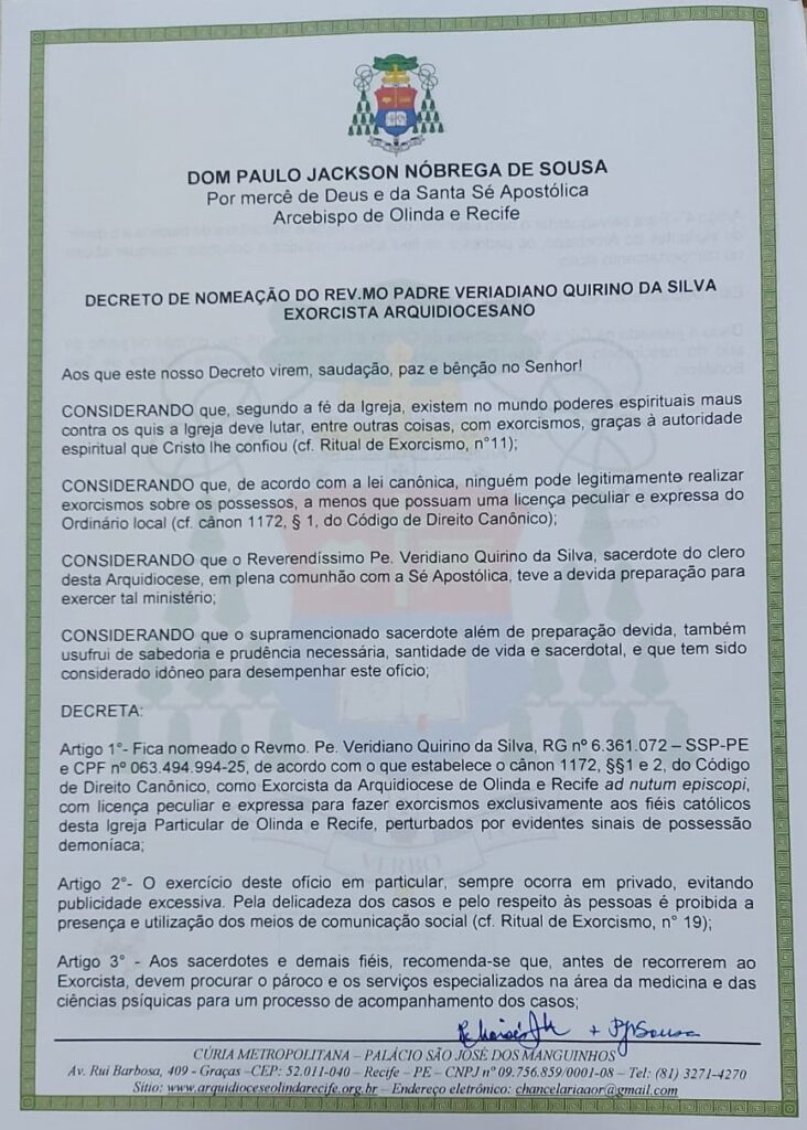 O arcebispo de Olinda e Recife, dom Paulo Jackson, decretou a nomeação do padre Veridiano Quirino como exorcista, em 5 de junho de 2024. Dessa forma, a Arquidiocese passa a ter dois padres exorcistas a serviço da comunidade arquidiocesana: padre Veridiano e padre Fabiano Cabral. No decreto, o arcebispo restringe os exorcismos ao território da Arquidiocese, sempre em privado e sem exposição excessiva, por respeito às pessoas. Recomenda ainda que, antes de recorrerem aos exorcistas, as pessoas devem procurar o pároco e os serviços especializados na área da medicina e das ciências psíquicas.